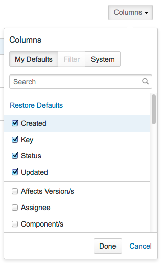 Пользователь JIRA имеет возможность изменять столбцы таблицы результатов поиска для любых результатов поиска, отображаемых с помощью представления списка (в отличие от подробного представления). Нажмите «Столбцы» (Columns) в верхней правой части таблицы задач, чтобы открыть диалоговое окно конфигурации столбца, показанное ниже.