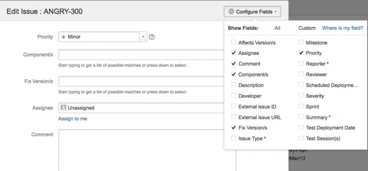 Скриншот: настройка полей в диалоговом окне «Редактировать задачу» (Edit Issue)