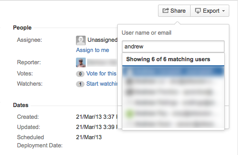 3. Укажите пользователей JIRA (набрав имена пользователей или их часть / все полные имена, зарегистрированные в учетных записях пользователей JIRA) или введите адреса электронной почты лиц, с которыми вы хотите поделиться задачей.