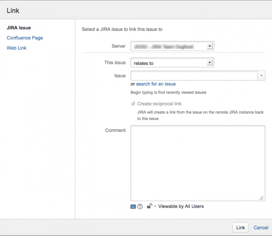 Если ваш системный администратор JIRA настроил полностью взаимные связи приложений между сайтом JIRA и другим сервером, выпадающий список «Сервер» (Server) может появиться над списком «Эта задача» (This issue). Если это так, убедитесь, что ваш сайт JIRA появился или был выбран из списка серверов.