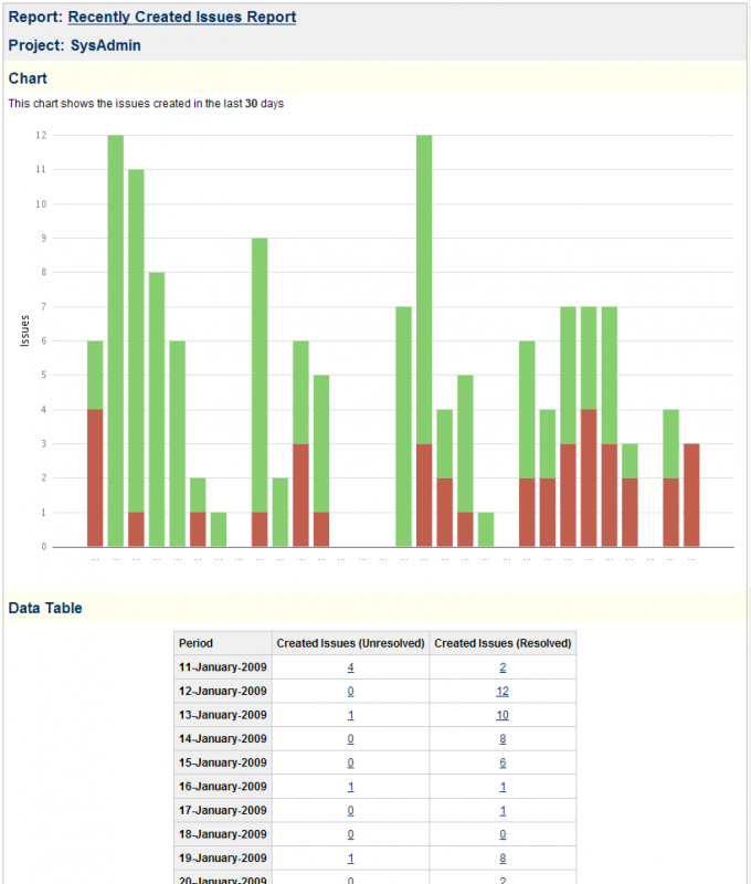Отчет «Недавно созданные задачи» (Recently Created Issues) представляет пользователю для просмотра гистограмму, показывающую скорость создания задач, а также количество разрешенных задач. Отчет основан на выборе пользователем проекта или фильтра задачи и выбранных им единицах отсчета времени (т. е. часов, дней, недель, месяцев, кварталов или лет).