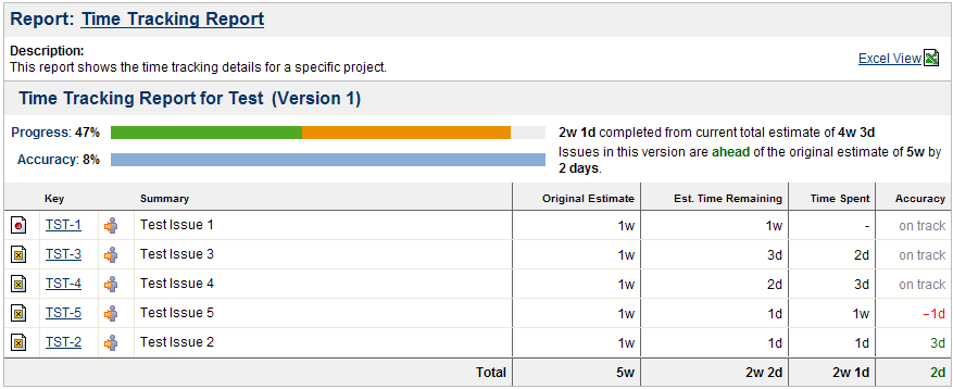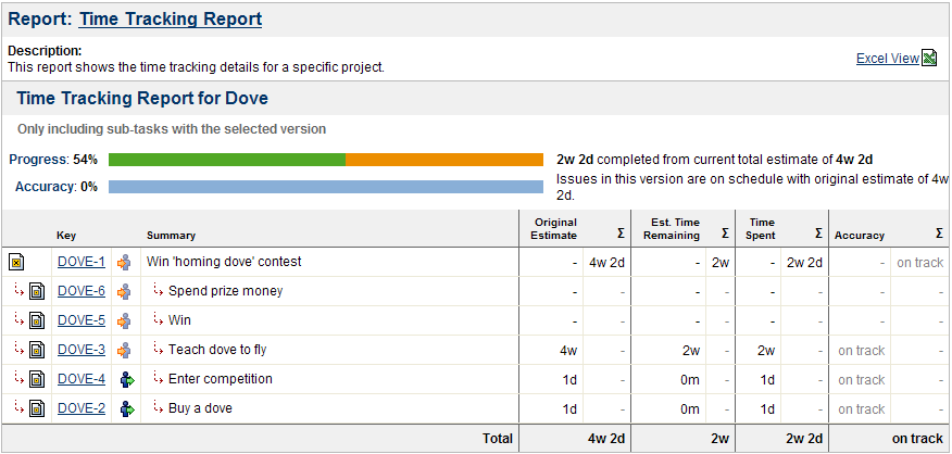 Отчет «Отслеживание времени» (Time Tracking Report) отображает полезную информацию о времени отслеживания задач для конкретной версии проекта. В этом отчете показаны исходные и текущие оценки времени для всех задач, и есть ли они впереди или позади первоначального графика. (Примечание: этот отчет доступен, только если отслеживание времени включено администратором JIRA).