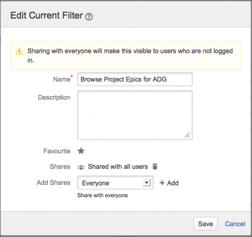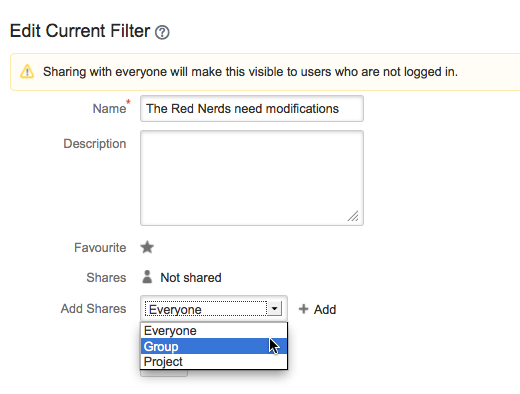 Обратите внимание, что вы можете делиться только фильтрами с группами / ролями, членом которых вы являетесь. Если функции распределения фильтров, показанные выше, недоступны для вас, у вас, вероятно, нет назначенного вам глобального разрешения Create Shared Object. Чтобы получить это разрешение, обратитесь к администратору JIRA.