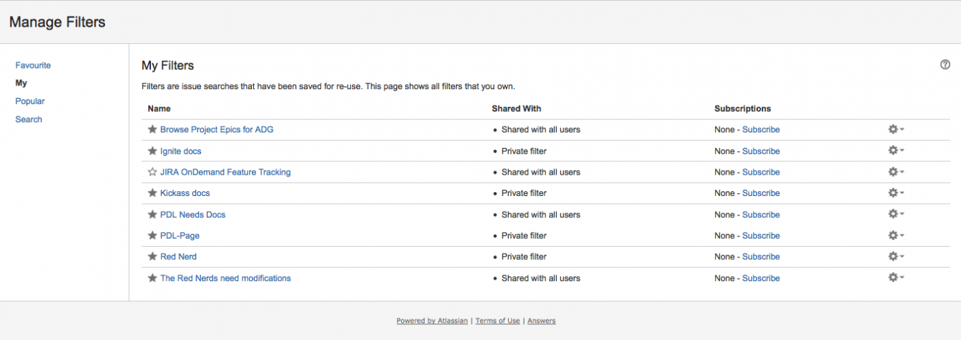 Страница «Управление фильтрами» (Manage Filters) позволяет пользователю просматривать и настраивать созданные фильтры, а также работать с фильтрами, которыми другие пользователи поделились с вами. Вы можете получить доступ к этой странице, выбрав «Найти фильтры» (Find filters) или в меню «Задачи» (Issues)> «Управление фильтрами» (Manage Filters).