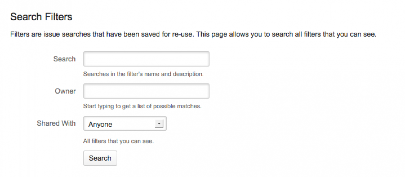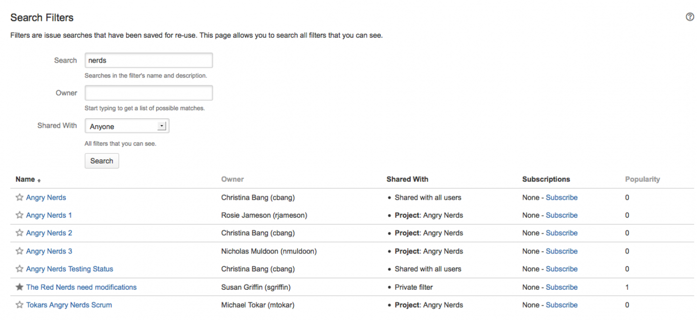 Созданные вами фильтры могут совместно использоваться другими пользователями через группы пользователей, проекты и роли проекта. Их также можно разделить на глобальном уровне. Любой совместно используемый фильтр отображается пользователям, имеющим глобальное разрешение администратора JIRA (JIRA Administrators) через функцию «Общие фильтры» (Shared Filters) . Подробнее см. «Управление другими фильтрами пользователя» ниже.