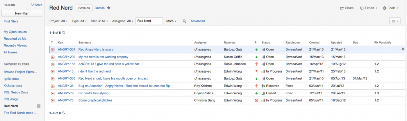 Мощная функция поиска задач JIRA для последующего использования пользвателем улучшена благодаря возможности сохранения поисков, называемых фильтрами в JIRA. Вы, как пользователь JIRA, можете использовать следующие фильтры JIRA: