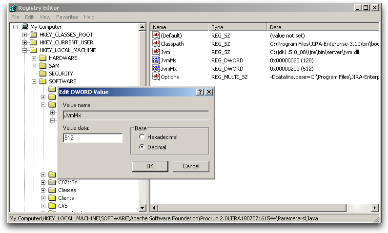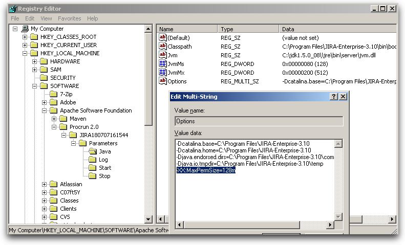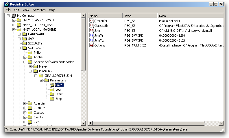 64-бит: HKEY_LOCAL_MACHINE> SOFTWARE> Wow6432Node> Apache Software Foundation> Procrun 2.0> JIRA