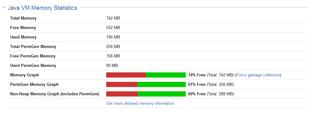 На этом сервере было выделено не более 768 МБ и минимум 256 МБ (обычно это определено в скрипте setenv, который выполняется при запуске сценария start-jira). Если вы пытаетесь выяснить, будут ли ваши настройки загружены приложениями JIRA, вам стоит их там посмотреть. Здесь вы можете видеть, что приложения JIRA зарезервировали 742 МБ, или которые на самом деле используются в 190 МБ. Если этот экземпляр приложения JIRA исчерпал память, он зарезервировал максимально доступный (768 МБ) и будет использовать сумму, близкую к этому.