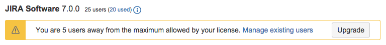 - Если вы находитесь рядом с максимумом пользователей лицензии, вы увидите баннер, предлагающий вам обновить. Нажмите кнопку «Обновить», чтобы перенаправить ее в форму заказа Atlassian.