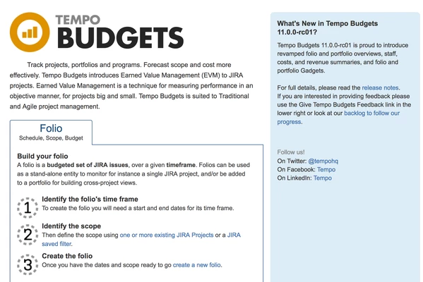 Менеджеры проектов сталкиваются с постоянными усилиями по управлению временем, объемом и бюджетными ограничениями. Tempo Budgets помогает вам управлять ограничениями, позволяя вам определять финансовый план, объем и временные рамки с помощью Folios.
