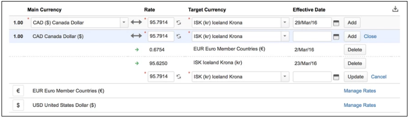 Чтобы обновить обменный курс валюты, вы можете просмотреть курсы валюты, нажав кнопку «Управление курсами» ("Manage Rates") справа от строки данной валюты. Отсюда вы можете щелкнуть курс, целевую валюту или дату вступления в силу строки и в интерактивном режиме изменить значения, изменения применяются при нажатии клавиши ввода или кнопки обновления.