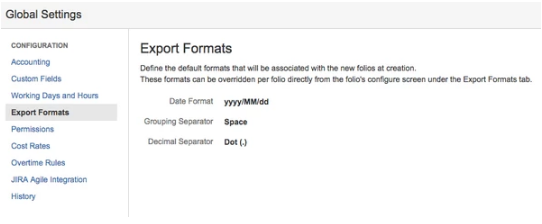 Вкладка «Форматы экспорта» ("Export Formats") позволяет указать форматы дат и чисел при экспорте затрат, доходов и сотрудников в CSV.