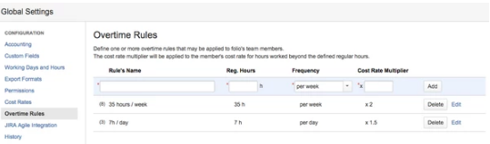 Определите одно или несколько правил сверхурочной работы, которые могут применяться к сотрудникам Folios. Множитель заработной платы будет применяться к заработной плате сотрудника за часы, отработанные сверх установленного обычного рабочего времени в день или в неделю.