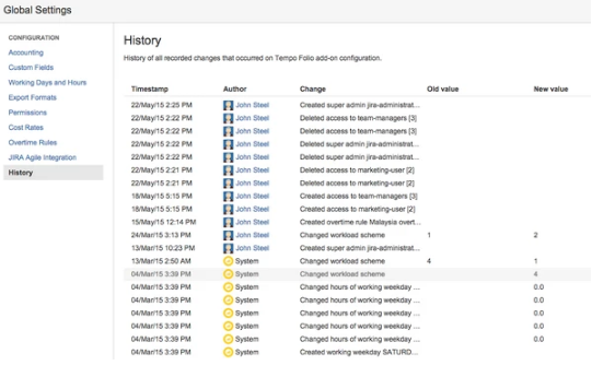 Суперадминистраторы Tempo Budgets могут просматривать историю изменений глобальной конфигурации. Войдя в систему как суперадминистратор Tempo Budgets, перейдите на страницу «Надстройки» ("Add-ons") и щелкните элемент «История» ("History") в разделе меню Tempo Budgets, чтобы просмотреть журнал аудита.