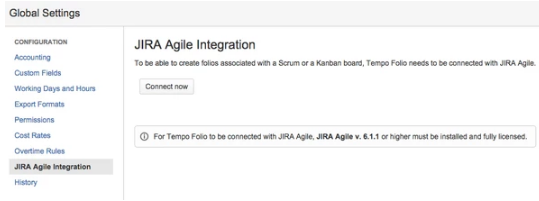 Чтобы иметь возможность создавать фолио, связанные с доской Scrum или Kanban, Tempo Budgets необходимо связать с JIRA Agile. По умолчанию Tempo Budgets автоматически определяет и пытается подключиться к JIRA Agile при запуске. Если по какой-либо причине Tempo Budgets не удается подключиться к JIRA Agile, вы можете вручную запустить подключение, нажав кнопку «Подключить сейчас» ("Connect now").