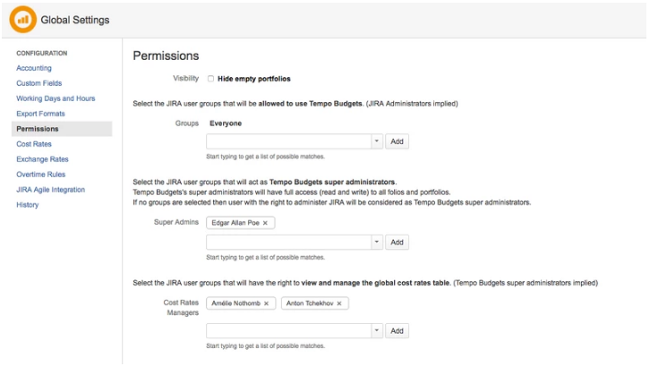 Вы можете указать одного или нескольких пользователей, которые будут выполнять функции суперадминистраторов Tempo Budgets. Суперадминистраторы имеют полный доступ в режиме чтения и записи ко всем фолио и портфолио, включая расценки. Только они могут редактировать глобальные настройки Folio (за исключением глобальных цен, которые могут редактировать менеджеры по тарифам). Если пользователь не указан, администраторы Jira по умолчанию являются суперадминистраторами. Обратите внимание, что вы можете потерять права редактирования глобальных настроек (включая разрешения), удалив себя из числа пользователей суперадминистратора.