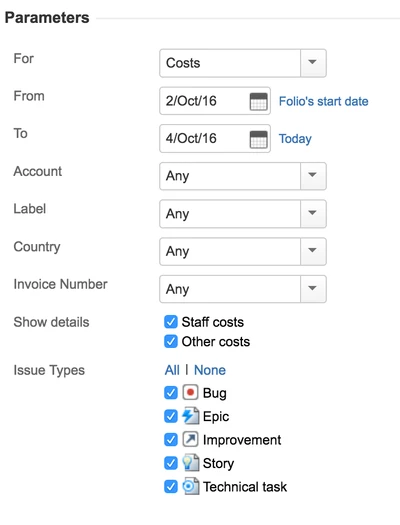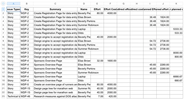 Все остальные расходы, связанные с этой задачей. К ним относятся затраты, не связанные с человеческими ресурсами (например, материалы и т. д.), и усилия, которые не указаны в рабочих журналах. Эти расходы распределяются по всем задачам пропорционально их весу заработанной стоимости (как определено их полем заработанной стоимости) в объеме. Распределение сверхурочных затрат для синхронизированного с сотрудником JIRA немного отличается, поскольку эти затраты распределяются по задачам, по которым сотрудник зарегистрировал время |