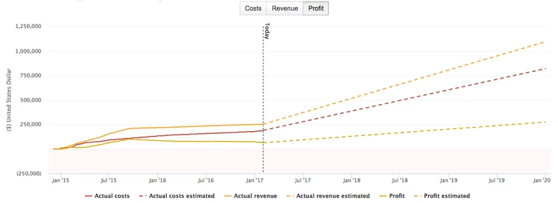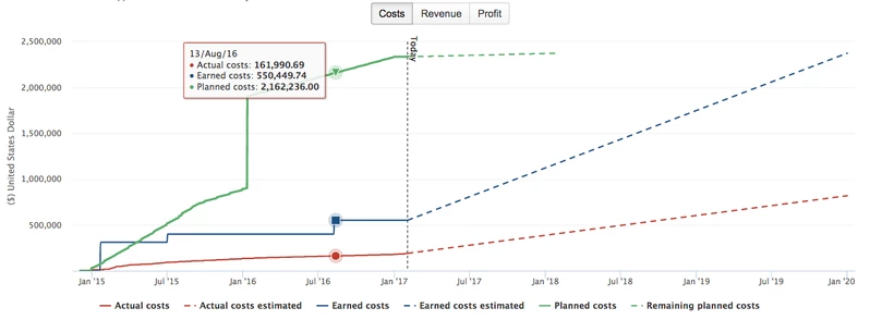 Линейный график в разделе «Финансы» показывает динамику затрат, доходов и прибылей, как запланированных, так и фактических, во времени. Пунктирная вертикальная линия указывает сегодняшнюю дату. Прошлые значения отображаются в виде сплошных линий, а прогнозируемые значения отображаются в виде пунктирных линий. При наведении курсора на одну из линий диаграммы отображается всплывающая подсказка с точными значениями для этой конкретной даты. Для получения более подробной информации о тенденциях и прогнозах посетите страницы «Прогнозы» (Затраты> Прогноз и доход> Прогноз) ("Costs > Forecast and Revenue > Forecast") портфолио. Вы можете показать / скрыть детали на диаграмме, щелкнув ярлыки повестки дня.