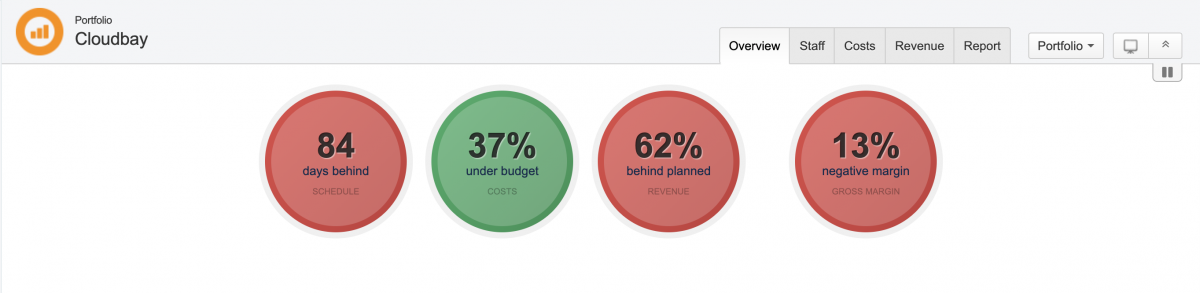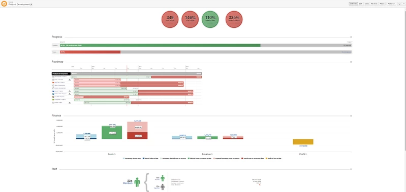 Главная страница или информационная панель разделена на семь разделов: индикаторы светофора, прогресс, дорожная карта обзора портфолио, финансы обзора портфолио, обзора персонала портфолио, дополнительная информация и заметки обзора портфолио.