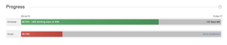 Щелкните ссылку «Показать / скрыть разбивку» (" Show/hide breakdown") на индикаторе выполнения области действия, чтобы отобразить или скрыть завершение области каждого элемента портфолио: