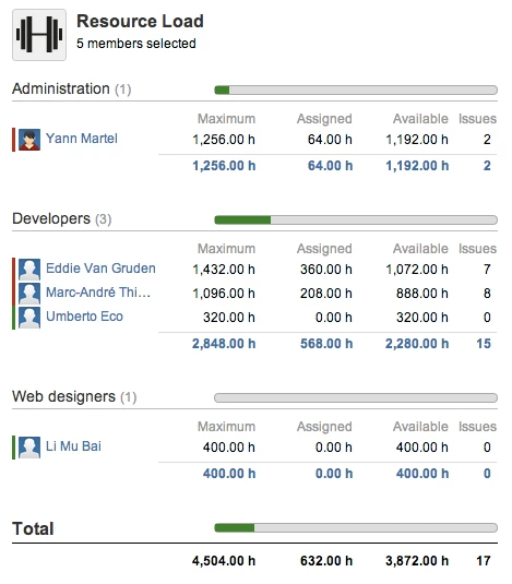 Виджет с цветной полосой, показывающий агрегированную информацию о загрузке ресурсов для всех назначений сотрудника. Если назначенные часы превышают возможность, пропорциональная часть полосы отображается красным цветом, указывая на то, что сотрудник перегружен. Наведите указатель мыши на панель, чтобы узнать точную загрузку ресурсов в часах.