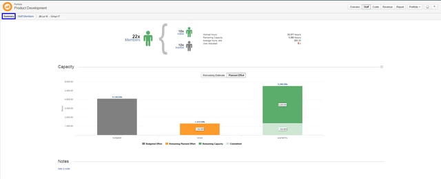 Экран «Персонал портфолио» позволяет легко отслеживать персонал, работающий над любым из проектов портфолио. Это дает вам кросс-проектное представление о людях, которое вы можете использовать, чтобы увидеть, кто перегружен. Это также позволяет вам видеть информацию о ставках тарифов, доступности и отработанном времени, а также краткое резюме задач, над которыми работает каждый человек. Перемещайтесь между представлениями «Резюме» ("Summary") и «Штатные сотрудники» ("Staff Members"), доступными в верхнем левом углу, когда выбрана вкладка «Персонал» ("Staff").