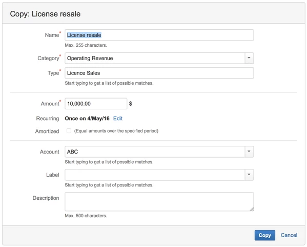 Вы можете выбрать существующий доход для копирования, а затем либо щелкнуть значок (