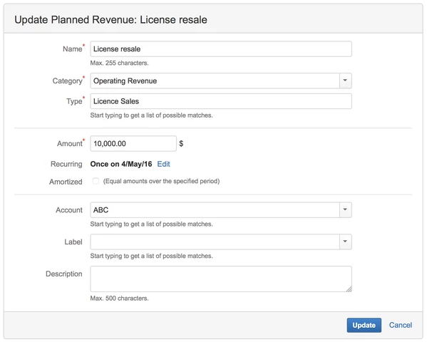 Вы можете изменить существующий доход, не связанный с консультациями, и легко изменить его. В представлении сведений о доходах справа щелкните многоточие (...) и выберите «Изменить» ("Edit") или нажмите клавишу «e» (для редактирования), чтобы отобразить диалоговое окно «Обновить запланированный доход» ("Update Planned Revenue").