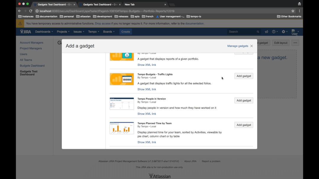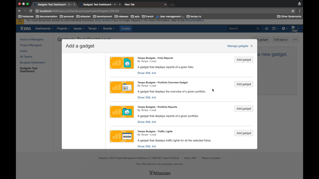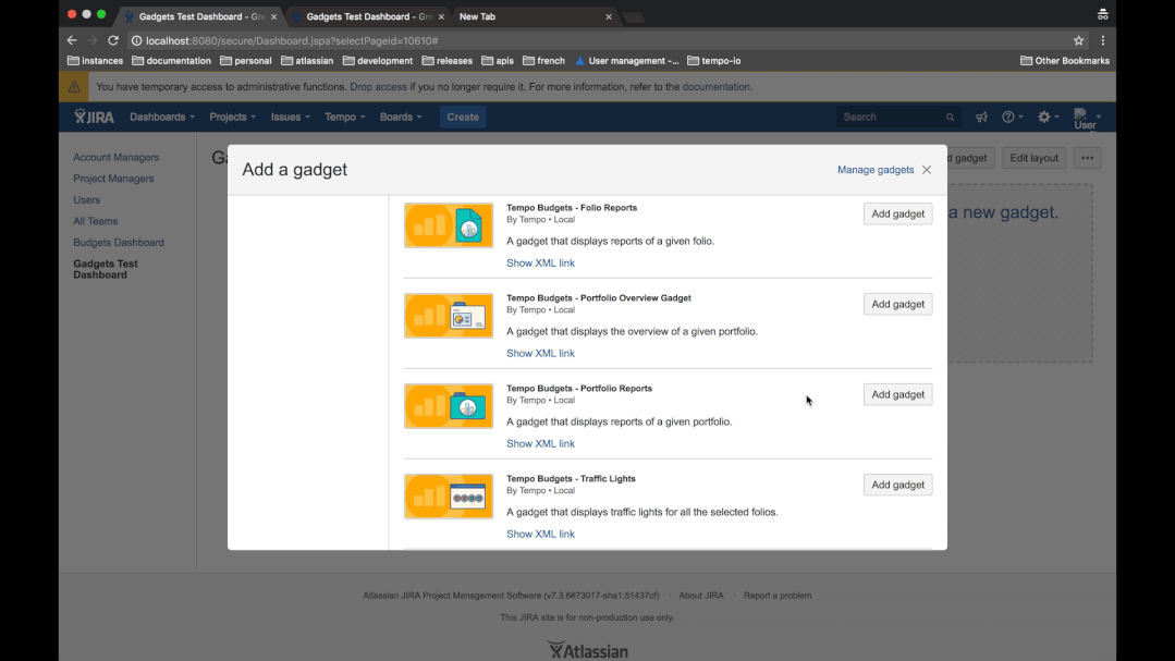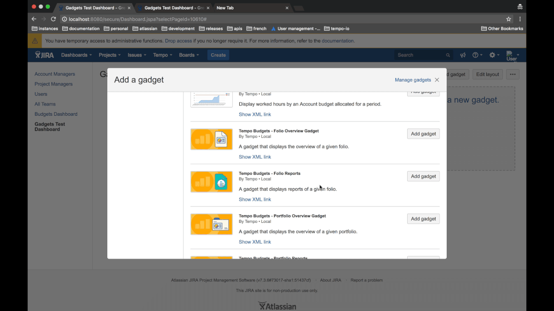 Tempo Budgets включает в себя ряд гаджетов, которые вы можете добавить в свои панели инструментов Jira, чтобы быстро обобщать информацию из бюджетов. Каждый гаджет можно настроить для отображения различной информации о ваших фолио или портфолио.