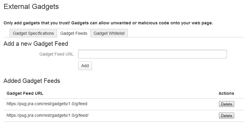 Чтобы удалить отдельный гаджет из Confluence, нажмите кнопку «Удалить» ("Delete") рядом с URL-адресом гаджета.