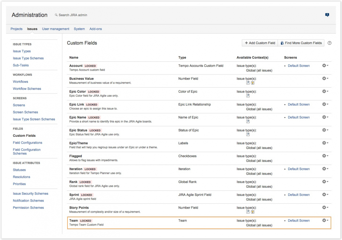 - Найдите пользовательское поле Tempo Team, которое по умолчанию не связано ни с какими экранами.