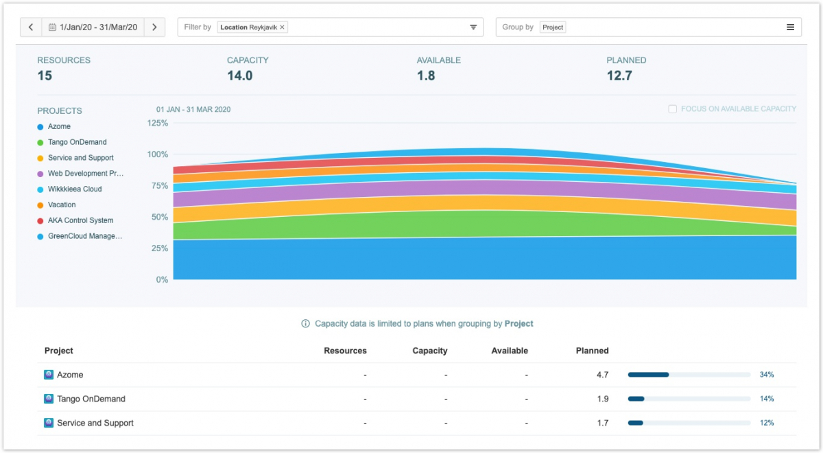 Например, вы можете просмотреть возможности по проектам, чтобы увидеть, на какие проекты вы запланировали больше всего ресурсов. Затем вы можете фильтровать по местоположению, например, чтобы увидеть проекты по местоположению. Точно так же вы можете сгруппировать по местоположению, чтобы лучше понять, куда вы можете добавлять новые проекты.