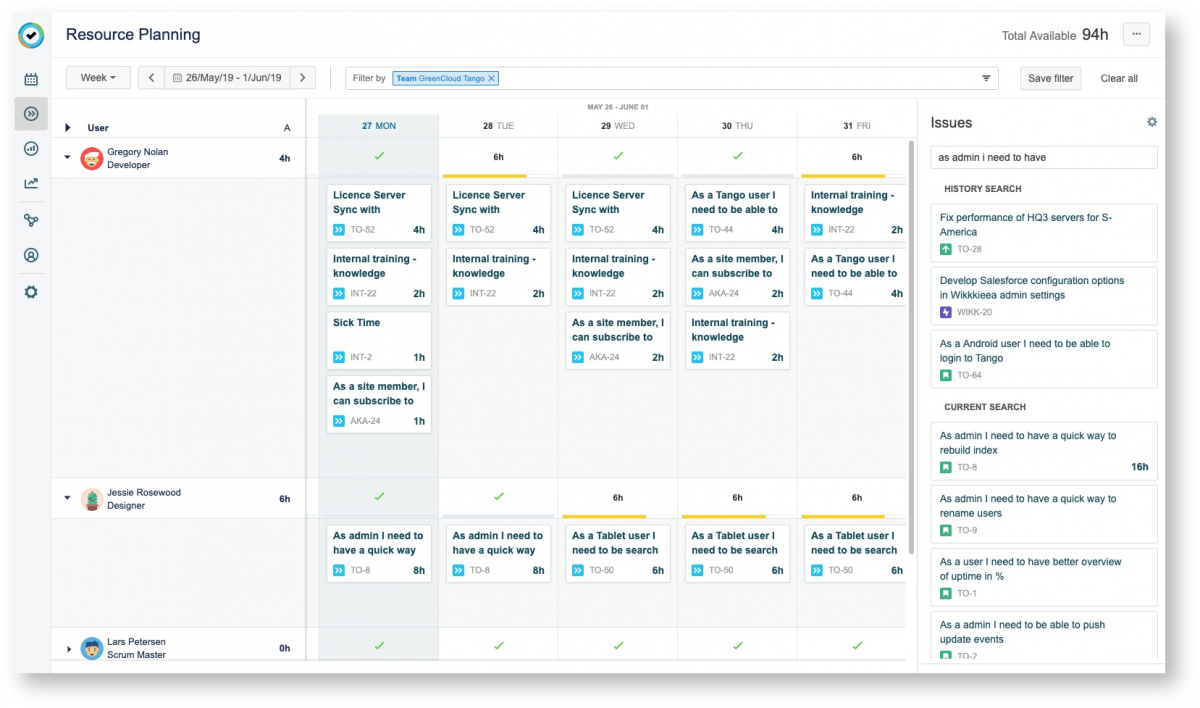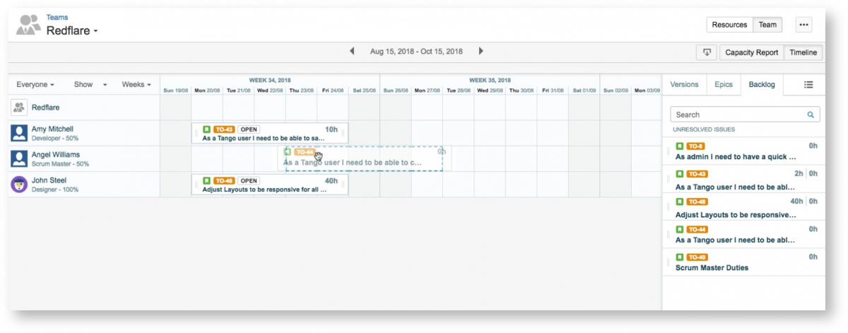 Используя «Отчеты Tempo» ("Tempo Reports"), вы можете получить обзор того, что запланировано для команды, какая работа была выполнена, и возможности команды для работы. Например, вы можете увидеть количество часов, зарегистрированных для задач для каждого члена команды, или количество часов, запланированных для предстоящего проекта.