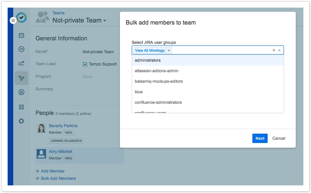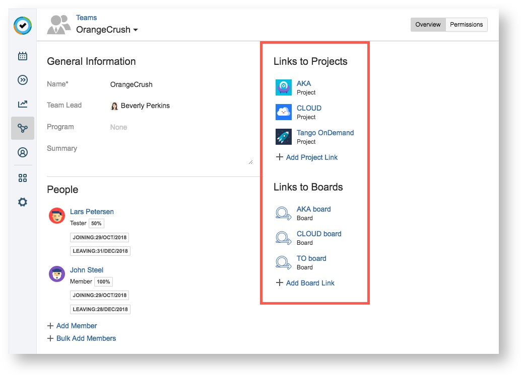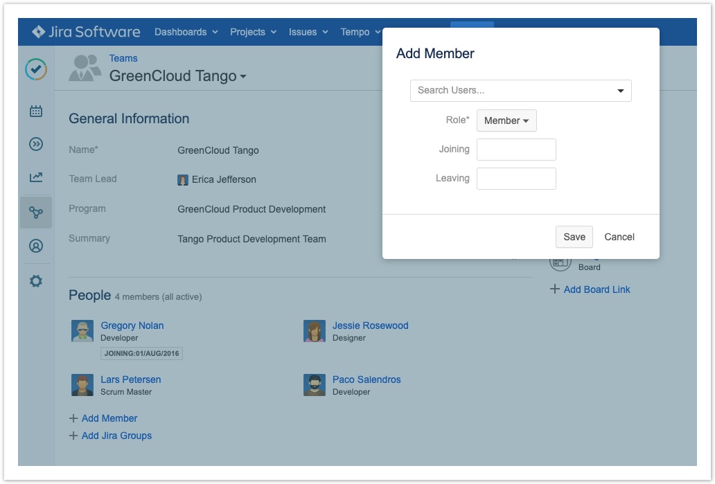 Вы также можете добавлять участников "навалом", используя группу Jira, которая является быстрым способом добавления нескольких участников одновременно. Однако, если вы сделаете это, вы не сможете установить командную роль, обязательство или даты присоединения и ухода каждого участника, поскольку группа Jira добавляется как объект.