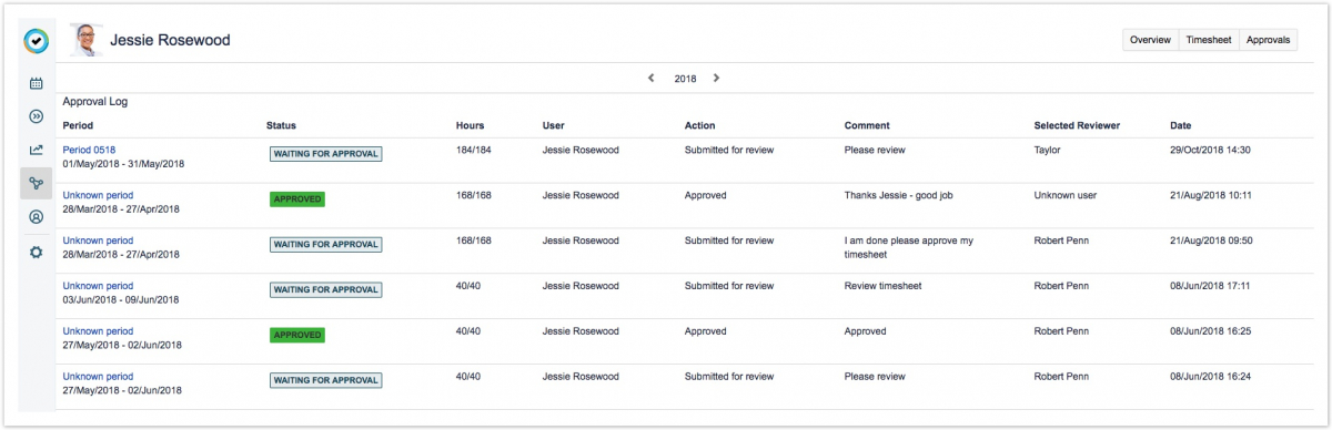 Вы можете просмотреть «Журнал утверждения» ("Approval Log") для членов вашей команды. Журнал утверждений показывает состояние утверждений расписания пользователя, имя проверяющего, дату и время действия и т. д. Журналы включают отметку времени, показывающую, когда произошло событие. Каждое действие в процессе утверждения расписания запускает журнал - один, когда расписание отправляется на утверждение, и другой журнал, когда расписание утверждается или отклоняется. Таким образом, полная история утверждений видна как утверждающему, так и члену группы.