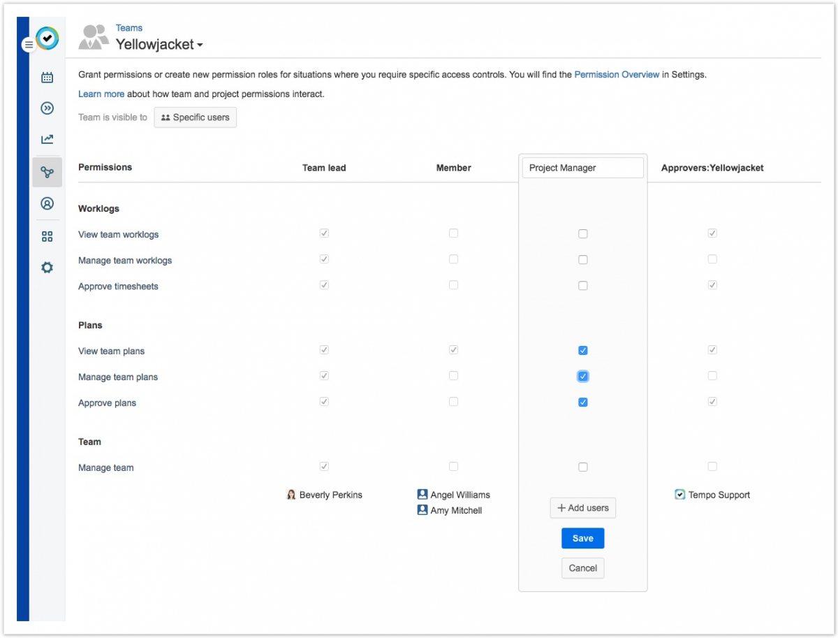 Роли разрешений команды позволяют указать, каким пользователям в Tempo должны быть предоставлены определенные разрешения. По умолчанию каждая команда имеет две роли по умолчанию: руководитель команды и член. Руководитель команды автоматически получает разрешение на просмотр, управление и утверждение всех планов и рабочих журналов, а также на управление командой. По умолчанию участники не имеют каких-либо разрешений группы, но руководитель команды может предоставить им разрешения. Добавление новой роли разрешений позволяет вам предоставлять определенных командных разрешений для нескольких пользователей одновременно, независимо от того, являются ли они частью команды или нет. Например, вы можете дать больше или все разрешения старшему члену команды, чтобы он был как руководитель команды.