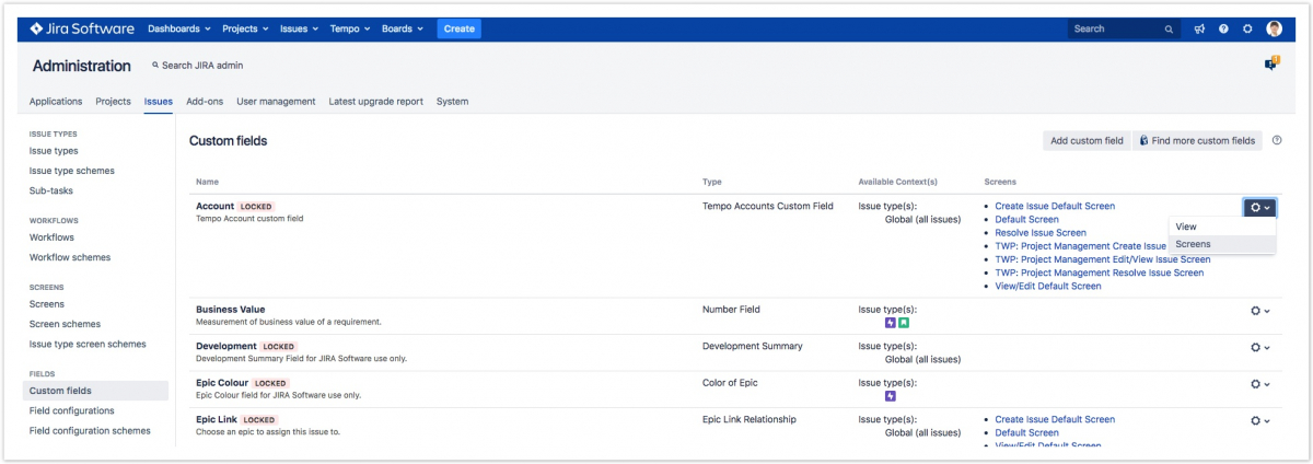 - Перейдите в раздел «Учетная запись» ("Account,"), отображаемый с типом Пользовательское поле учетной записи Tempo ("Tempo Account Custom Field"). Нажмите «Настройки» ("Settings") справа и выберите «Экраны» ("Screens") в раскрывающемся списке.