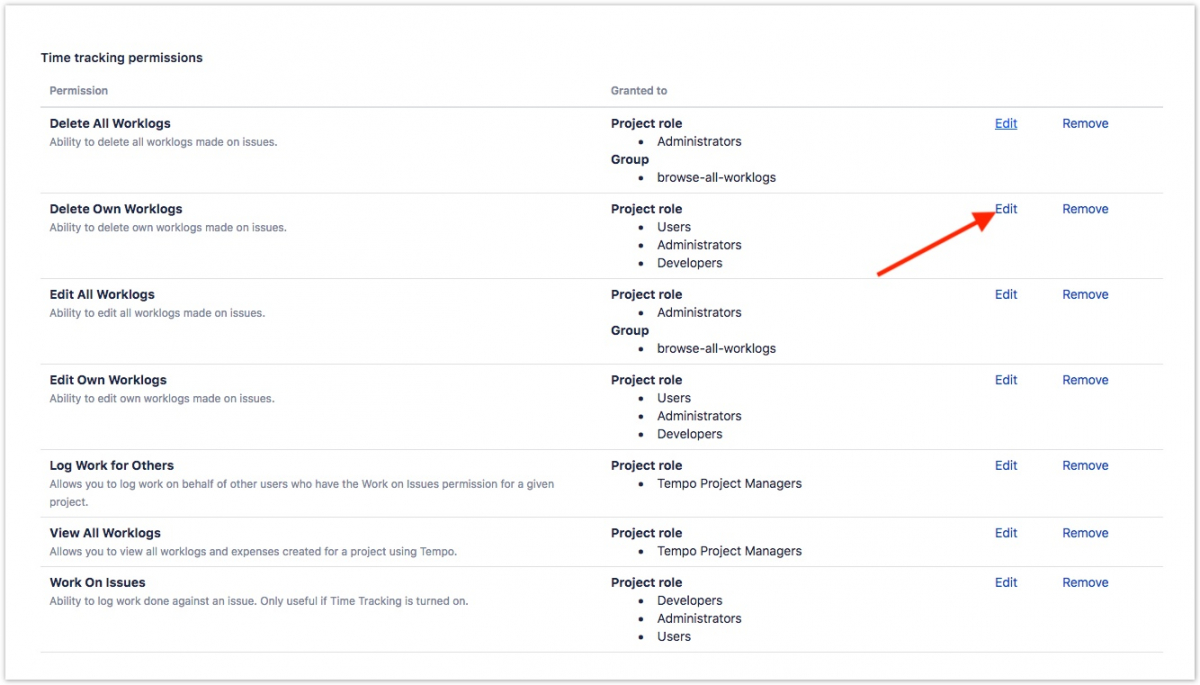 - Перейдите к разрешению «Отслеживание времени» ("Time tracking"). Найдите «Удалить собственные рабочие журналы» ("Delete Own Worklogs") и нажмите на ссылку «Изменить» ("Edit").