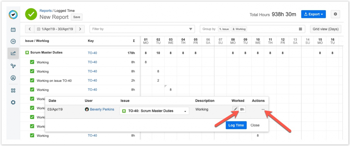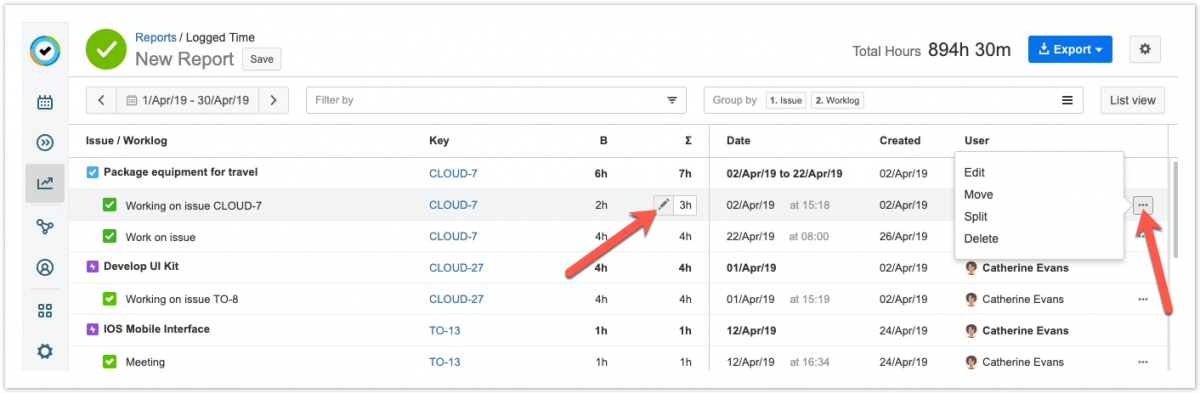 Если у вас есть разрешение на редактирование рабочих журналов, вы можете изменить данные непосредственно в отчетах «Зарегистрированное время» ("Logged Time"). Вы можете редактировать рабочие часы, перемещать, разделять и удалять рабочие журналы.