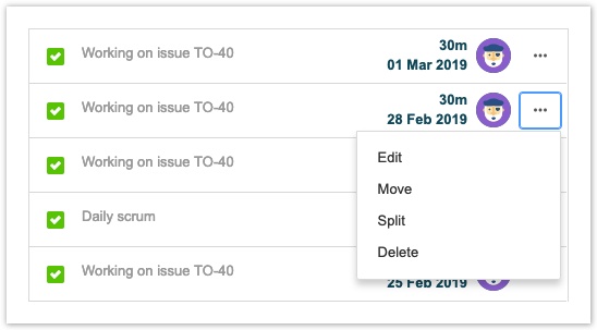 Чтобы редактировать рабочие журналы в просмотре задач Jira Issue, щелкните многоточие (...) справа в рабочем журнале, который вы хотите отредактировать, и выберите нужный параметр.