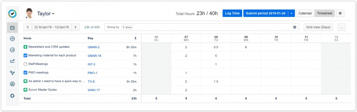 Вы можете выбрать различные параметры просмотра, чтобы настроить табель учета рабочего времени для отображения важной для вас информации. Вы также можете организовать табель учета рабочего времени, сгруппировав рабочие журналы, например, по проекту Jira, учетной записи клиента или задаче Jira.
