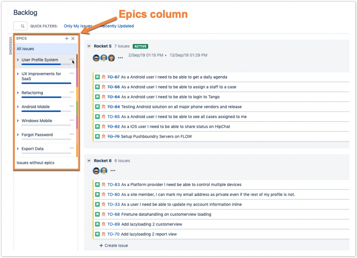 Рисунок 1. Список необходимых требований  Jira scrum, который показывает столбец EPICS и два спринта, которые называются «Ракета 6» и «Ракета 7».