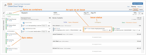 Рисунок 3. Список необходимых требований  команды в планировщике Tempo Planner (доступен в Planner 6.2 и более ранних версиях). Список необходимых требований показывает итерацию с именем «Ракета 8». С левой стороны эпики рассматриваются как контейнеры для задач. Например, эпик TO-42 («Рефакторинг») может содержать различные задачи, которые могут быть добавлены к различным итерациям. Одна из этих задач (TO-69) была добавлена в итерацию «Ракета 8» и указана в столбце «Неназначенные задачи» итерации. Оттуда это может быть назначено члену команды. Эпик TO-88 («Забыли пароль»), который также может содержать различные задачи, рассматривался как задача, добавленная в итерацию и назначенная Бобу Джонсону. Если статус задачи изменяется, задача перемещается в другой столбец.