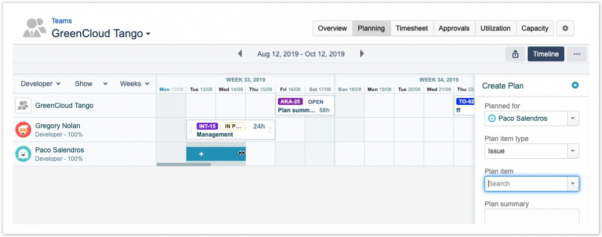 1. Чтобы создать план на один день, укажите на поле даты для соответствующего члена команды и щелкните появившийся плюс. Вы можете нажать и перетащить указатель по дням, чтобы планировать на более длительные периоды. Боковая панель «Создать план» ("Create Plan") открывается справа от временной шкалы.