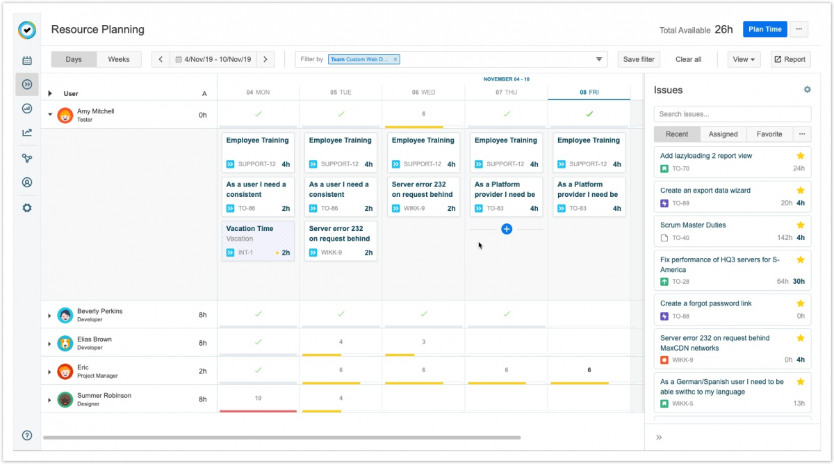 Просмотр «Планирование ресурсов» (Resource Planning) показывает доступность ваших ресурсов и позволяет сразу увидеть, у кого из членов команды есть свободные часы, а кто перебронирован. Вы можете выбрать между просмотром по дням для получения более подробной информации или просмотром по неделям для увеличения. Настройте вид и используйте фильтры при просмотре ресурсов и планируйте время своей команды на уровне задачи или проекта непосредственно на временной шкале или перетаскивая задачи из боковой панели «Задачи». Планирование ресурсов показывает членов команд, которые видны вам.