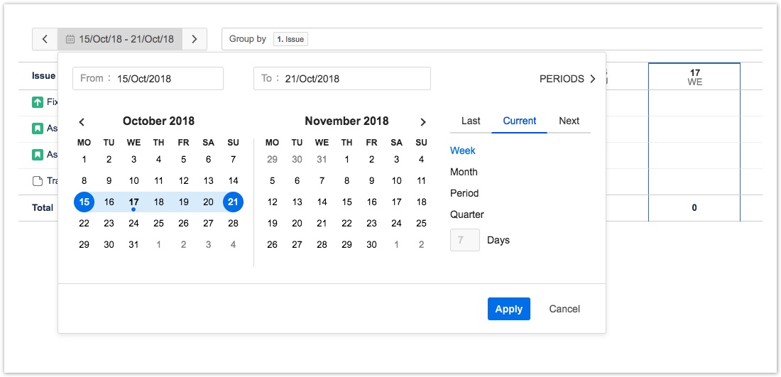 • Выберите период: поле даты показывает отображаемый период времени. Используйте стрелки «< >» для перехода к следующему или предыдущему периоду. Щелкните поле даты, чтобы настроить вид расписания для отображения дня, недели, месяца или пользовательского периода. Вы также можете переключить отображение на предыдущий, текущий или следующий период. При просмотре табеля учета рабочего времени в виде сетки вы также можете нажать кнопку «Просмотр сетки» ("Grid view") в правом верхнем углу и выбрать периоды сетки.