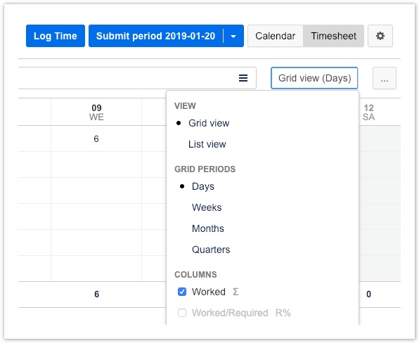 • Выберите, какая информация отображается: Нажмите «Просмотр сетки» / «Просмотр списка» (Click "Grid view"/"List view") в правом верхнем углу. Под «Столбцы» ("Columns") выберите параметры, которые вы хотите отобразить в табеле учета рабочего времени. По умолчанию выбрано общее количество отработанных часов. В представлении «Просмотр списка» можно выбрать «Столбцы просмотра списка» ("List View Columns") для отображения определенных атрибутов рабочего журнала ("Worklog attributes").