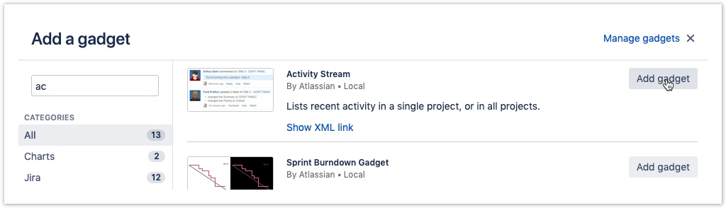 В «Поток активности» ("Activity Stream") перечислены последние действия в одном проекте или во всех проектах. Чтобы добавить «Поток активности» ("Activity Stream"), нажмите «Добавить гаджет» ("Add gadget") на панели инструментов, найдите гаджет и нажмите «Добавить гаджет» ("Add gadget").