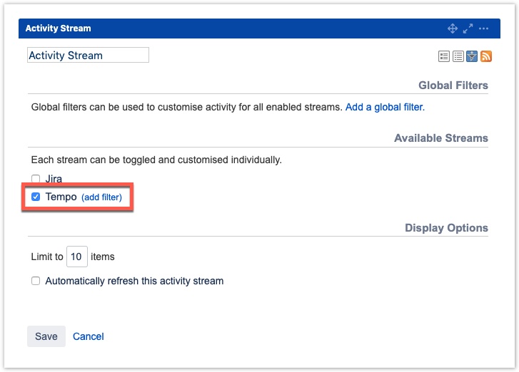 Настройте гаджет «Поток активности» ("Activity Stream") для включения Tempo: