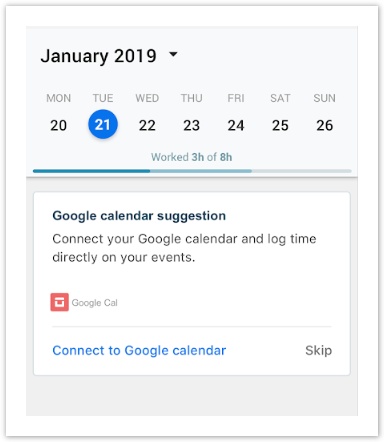 Если отслеживаемое время часто совпадает с событиями в календаре Google, интеграция приложения календаря с Tempo mobile позволяет просматривать расписание календаря и быстро регистрировать время в нем.